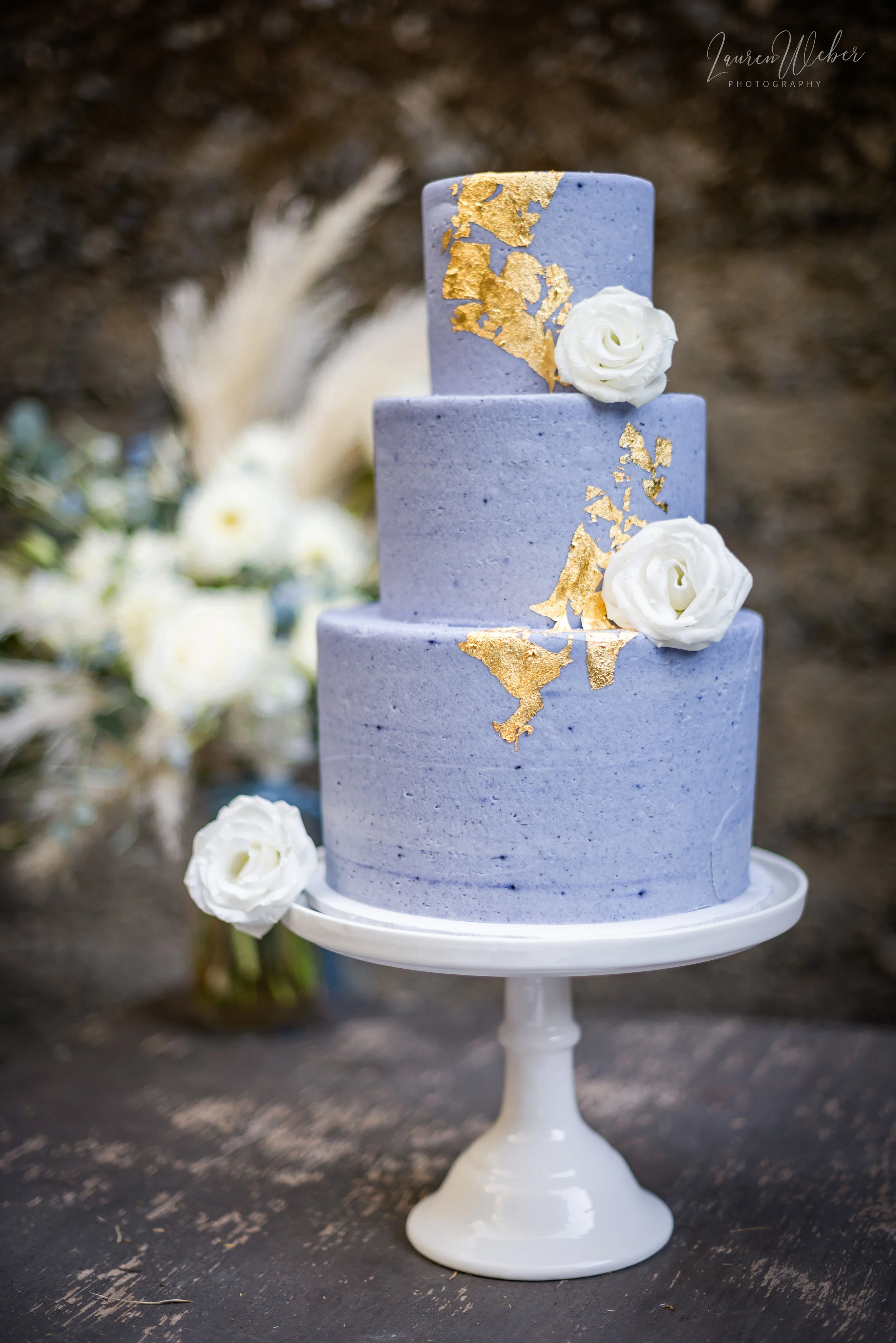 This blue and gold cake was created by Buttercup Cakes & Farmhouse Frosting. They are a local bakery in Santa Cruz, and Annie did an amazing job on this gorgeous cake! We incorporated some of the florals once we were finished with the table photos, and the gold accents with it really pulled everything together.