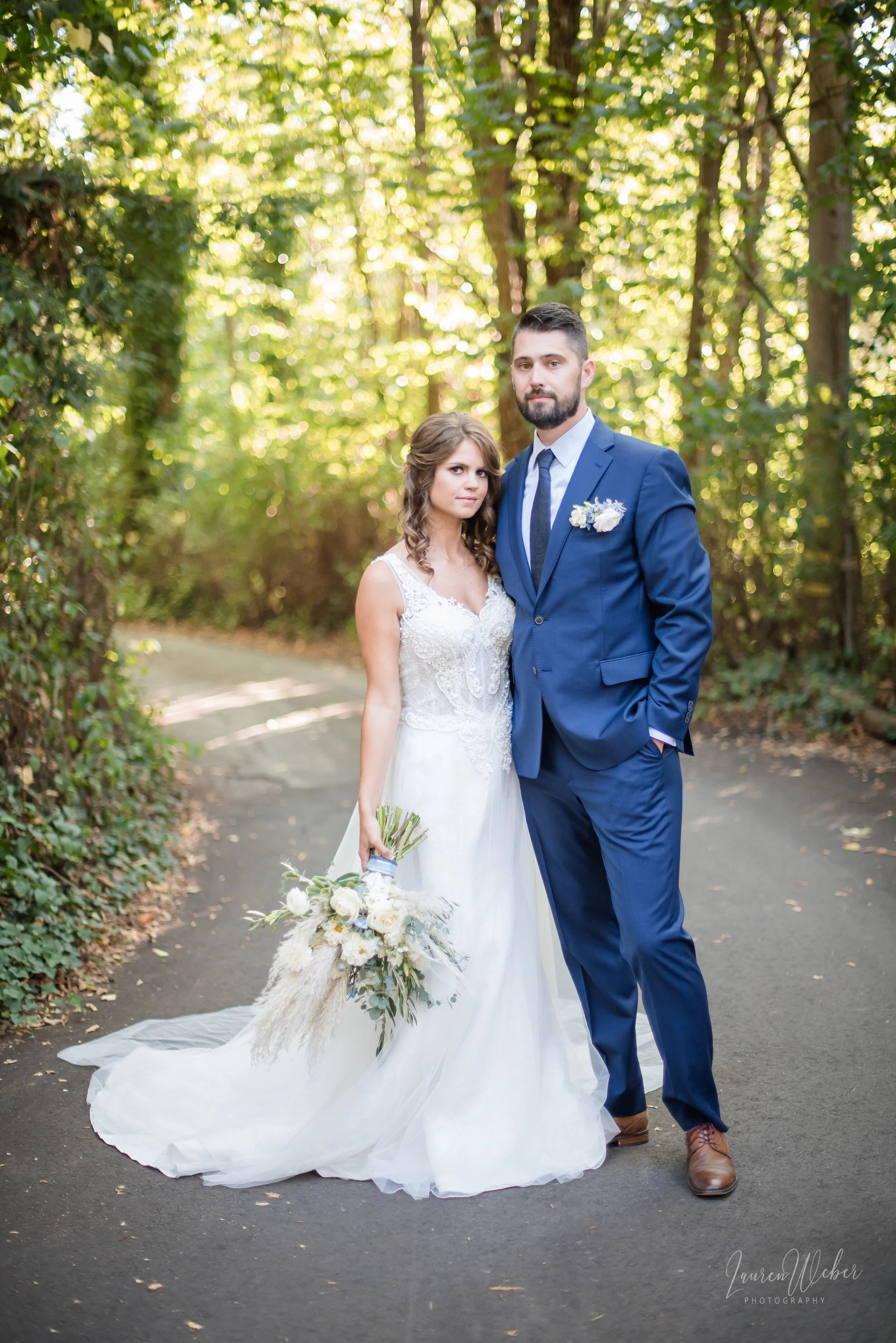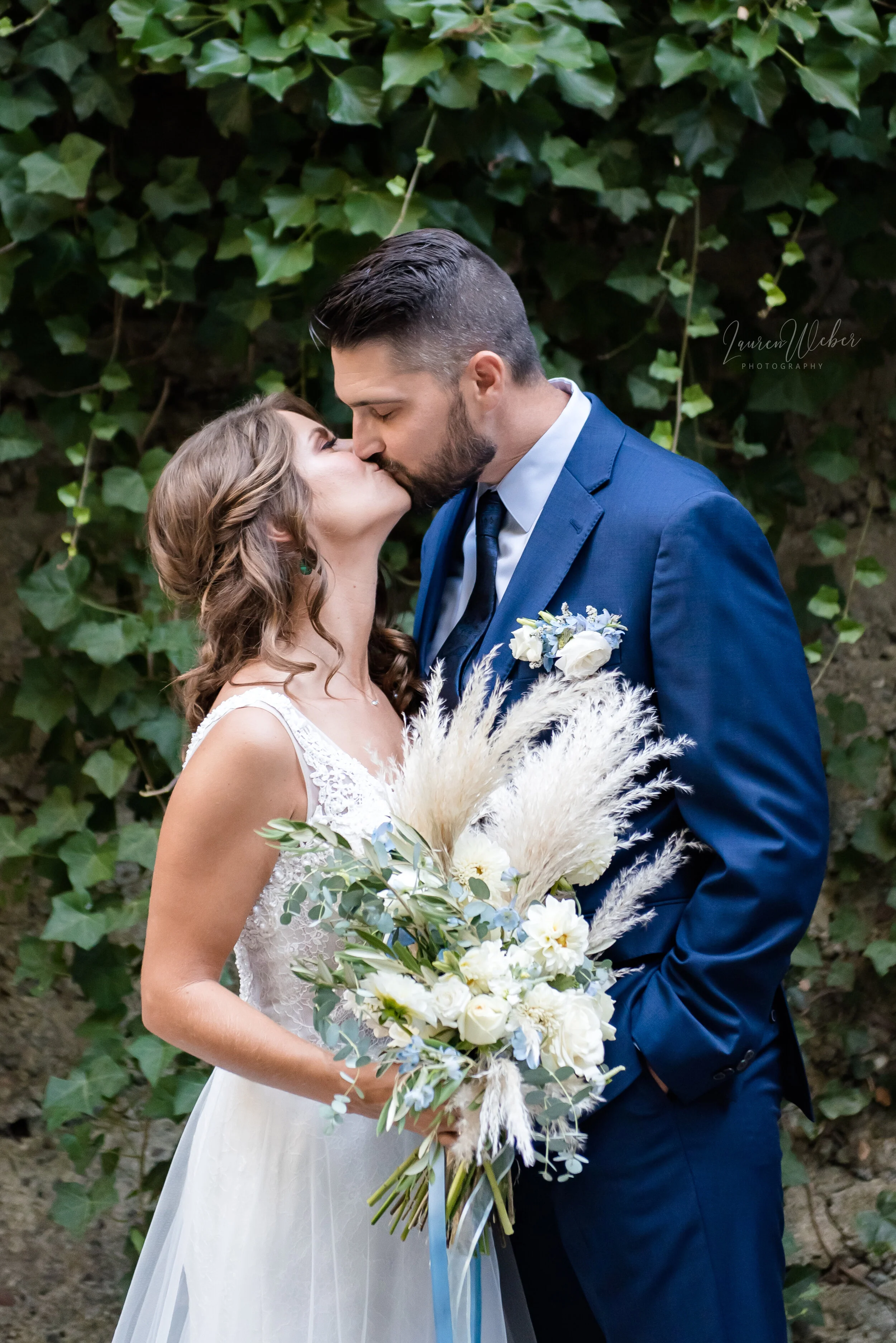 How gorgeous is this dress?! I was so in love with how beautiful it was, it’s the style Zoella from Silviyana. The lace detail was unlike anything I’ve seen, it has small floral decals around the bodice. The hair and makeup was all done by Teri at Charismatic Bride - she slayed it! The neutral tones in the makeup made Autumn’s brown eyes pop, and worked so beautifully together with the pops of blue in the flowers and suit.